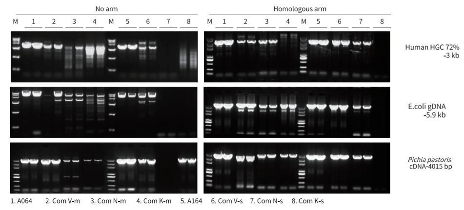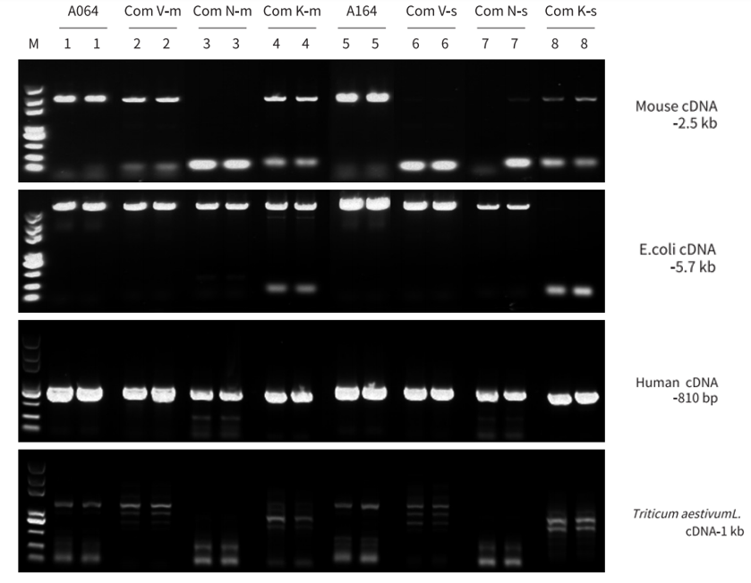 分別以人、小鼠、E.coli cDNA 為模板,使用 A064/A164、Com V、Com N、Com K 進(jìn)行不同長(zhǎng)度片段擴(kuò)增。結(jié)果顯示,A064/A164 對(duì)不同種屬來源不同長(zhǎng)度的 cDNA 片段兼容性強(qiáng),均能良好擴(kuò)增