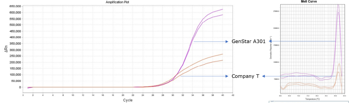 以 Hela 細胞 cDNA 為模板,按10倍濃度梯度稀釋,根據 Ct 值構建標準曲線。結果顯示,GenStar #A301 擴增效率高、標準曲線線性范圍寬、重復性好。