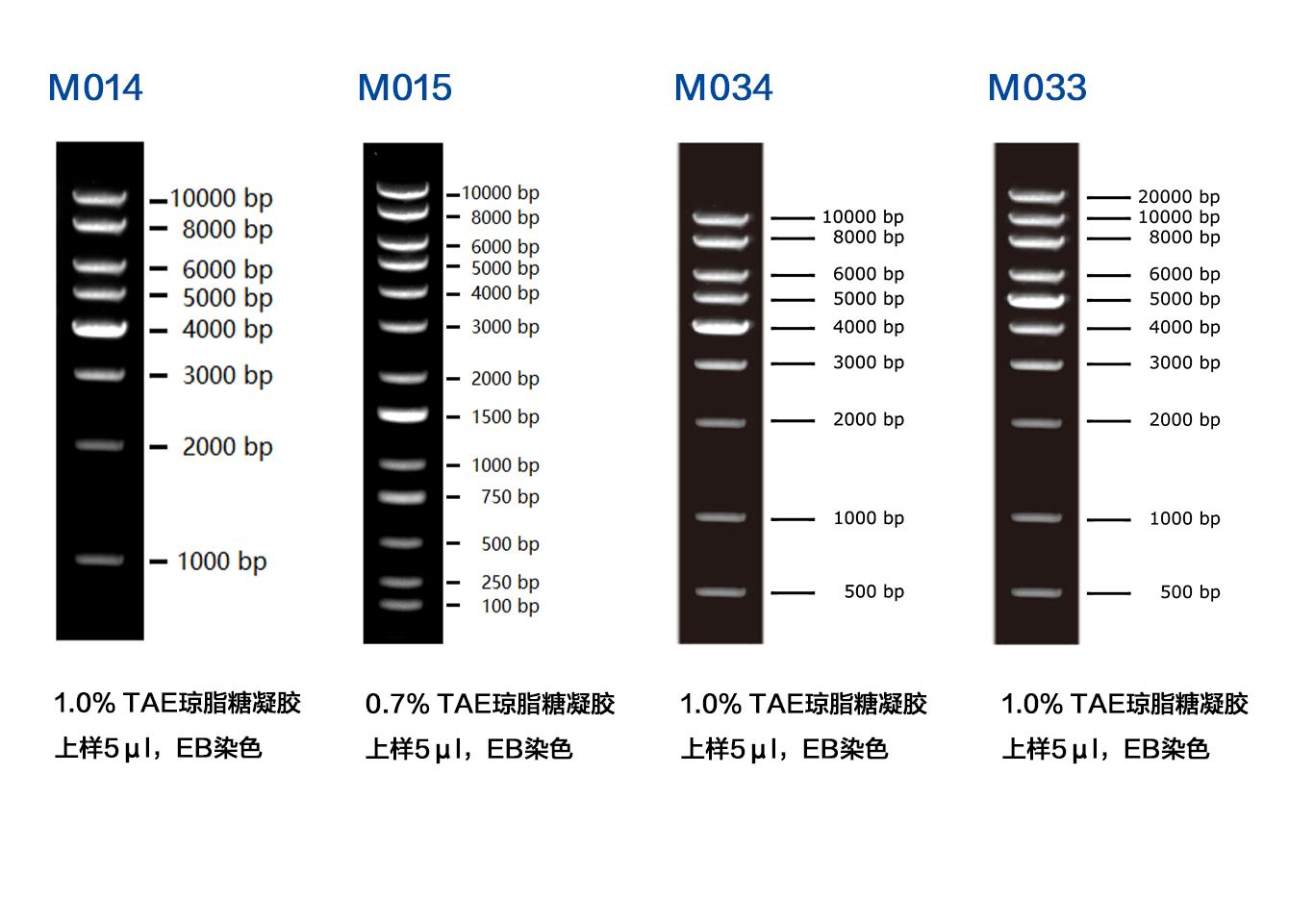 本產品為預混有 1x 上樣緩沖液的即用型 DNA 分子量標準,由 13 條線狀雙鏈 DNA 條帶組成,適用于對 100 bp 至 10 kb 的雙鏈 DNA 分子大小的估算和粗略定量。本產品的 13 條帶分別為 100,250,500,750,1000,1500,2000,3000,4000,5000,6000,8000 和 10000 bp。其中 1500 bp、750 bp 條帶濃度最大,為 20 ng/µl,其余條帶濃度約為 10 ng/µl