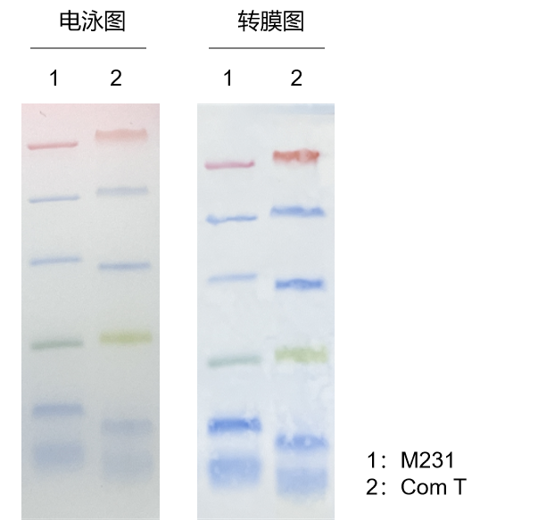 分別使用GenStar #M230 和 Com T進行電泳,Tricine 膠濃度18%,上樣量5 μl、電壓150 V,電泳100 min,電泳結束后進行轉膜實驗,轉膜電壓200 V、時間60 min。結果顯示,M230電泳和轉膜條帶均清晰可見,小條帶效果優(yōu)于Com T。