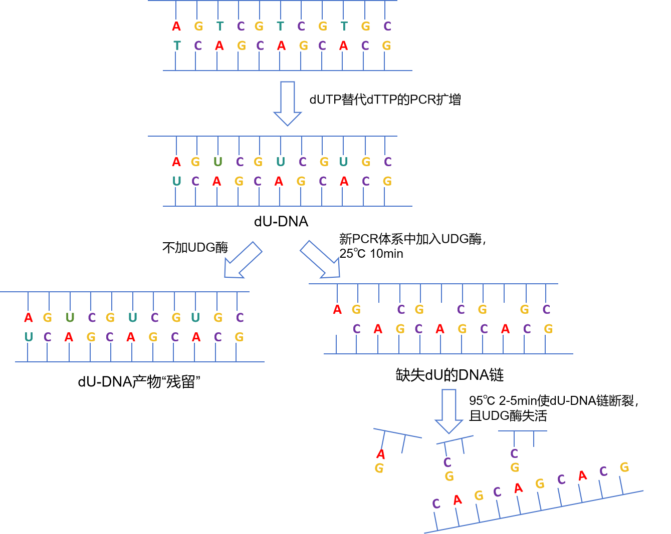 利用UDG酶選擇性水解含dU的DNA單鏈或DNA雙鏈的機制,巧妙地引入dUTP取代PCR體系中的dTTP而構成了dUTP/UDG酶防污染系統。