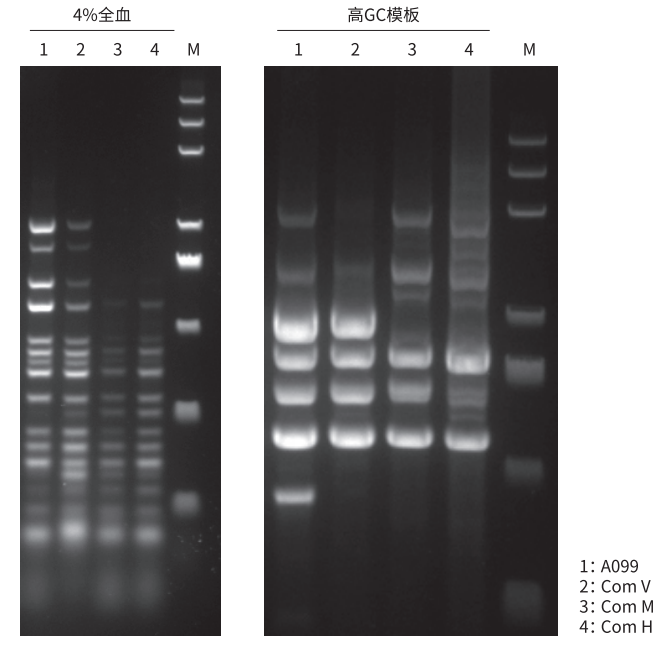以 Human 基因組為模板,同時擴增 19 個目的片段。結果顯示,A099 最低檢測限可達 0.1 ng,不會出現條帶丟失且條帶清晰優于 Com V