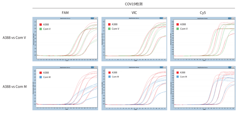 以不同濃度的 COV19 為模板,分別用 A388、 Com V 、Com M 進行檢測。結果顯示,A388 和 Com V、Com M 擴增效果相當,A388 擴增曲線和熒光強度優于 Com M