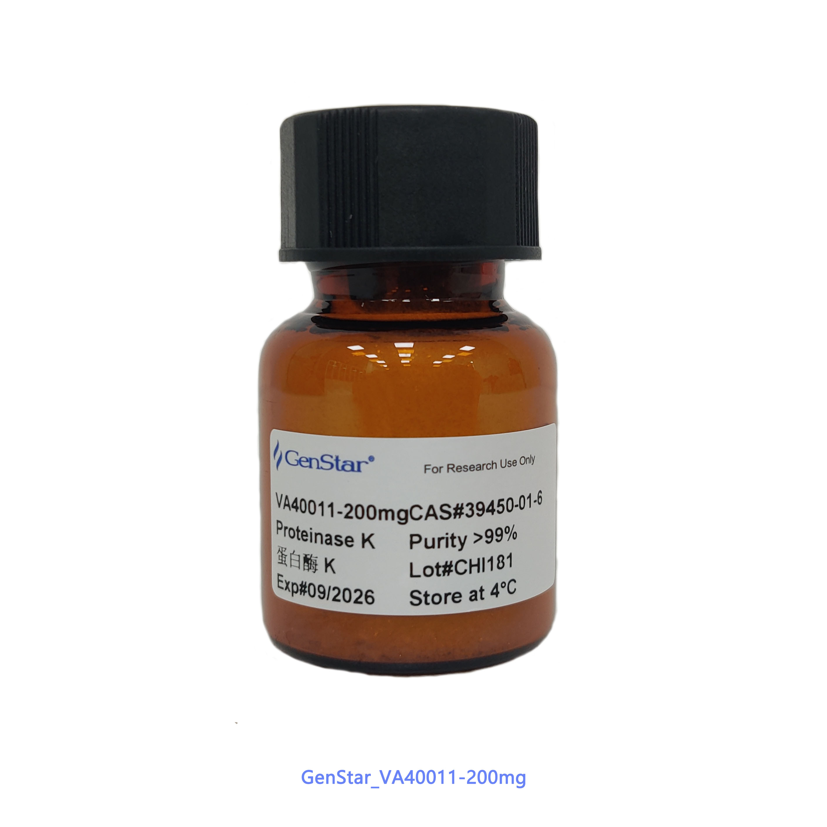 Proteinase K(蛋白酶 K)是一種廣譜的、高活性絲氨酸蛋白酶,其活性受 pH 值、高溫、EDTA、去垢劑和尿素等因素的影 響較小,因而被廣泛應用于核酸提取和純化時促進細胞裂解、去除蛋白質污染,蛋白結構和功能分析,也可用于酶促反應后, 酶的消化去除等。