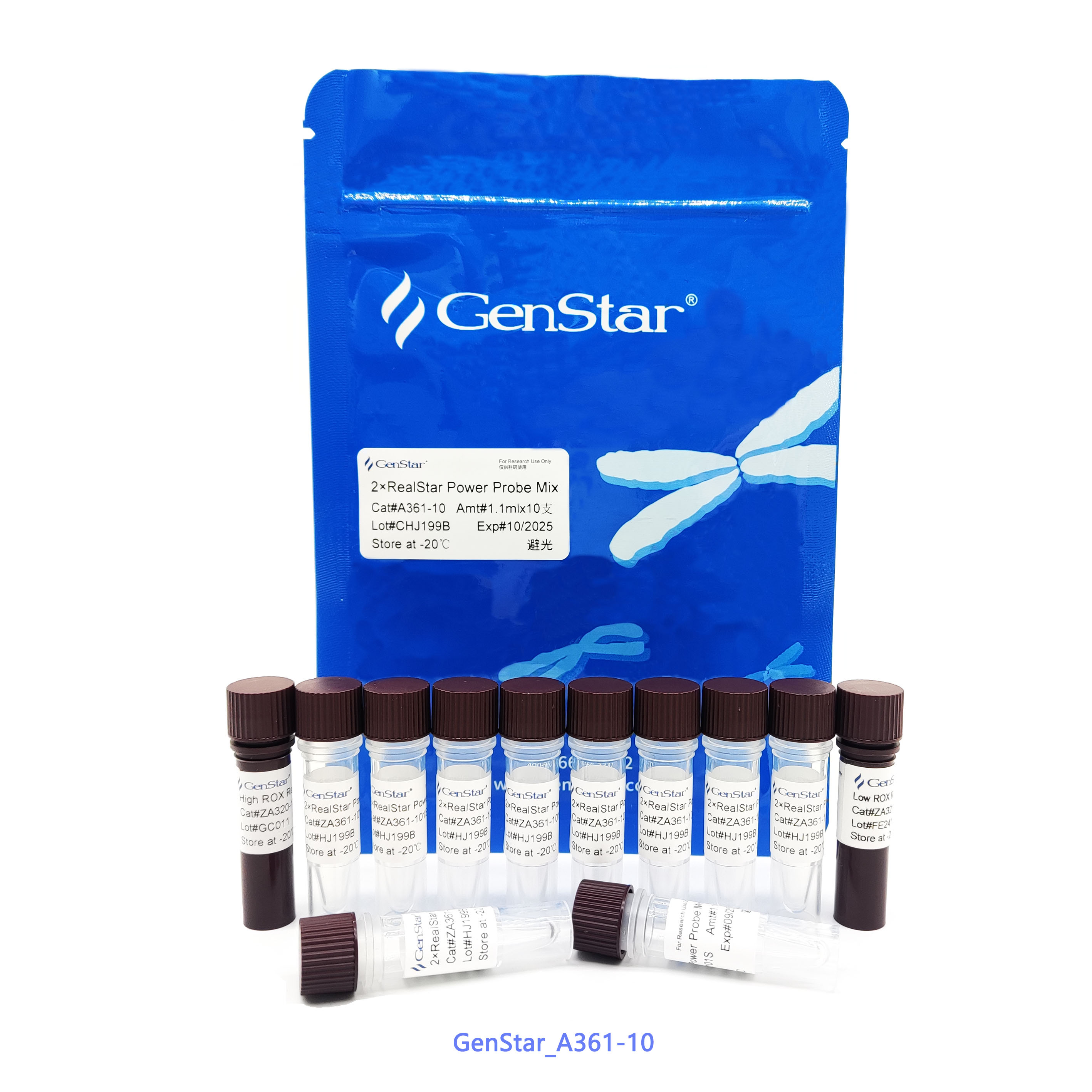 本產(chǎn)品是專用于探針法(TaqMan,Molecular Beacon 等)實時熒光定量的預混體系。產(chǎn)品含有優(yōu)化濃度的 GenStar Power HSTaq DNA Polymerase、dNTPs、Mg2+、反應緩沖液和穩(wěn)定劑等成分。Power HSTaq DNA Polymerase 在 75℃ 以下沒有活性,從而有效避免在常溫條件下由引物和模板非特異性結合或引物二聚體而產(chǎn)生的非特異性擴增,酶的激活需要 95℃ 孵育 10 min。反應體系可在室溫下配制,無需在冰上完成,操作方便。主要用于基因組 DNA 靶序列和 RNA 反轉錄后 cDNA 靶序列的檢測,如基因表達分析、拷貝數(shù)分析、SNP 基因型分析等,適用于不同類型探針法熒光定量 PCR。