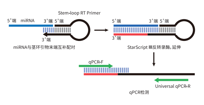 本試劑盒基于 StarScript III 反轉錄酶開發的,采用莖環結構的逆轉錄引物與 miRNA 分子 3’ 端結合,在 StarScript III 反轉錄酶的作用下,獲得人為加長的 miRNA 第一鏈 cDNA。
