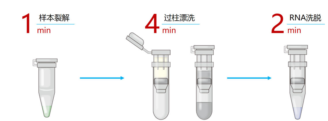 操作步驟簡單快速,可在 7 min 內完成單個樣品 RNA 的提取,無需使用苯酚和氯仿等有機溶液,操作安全性更高。