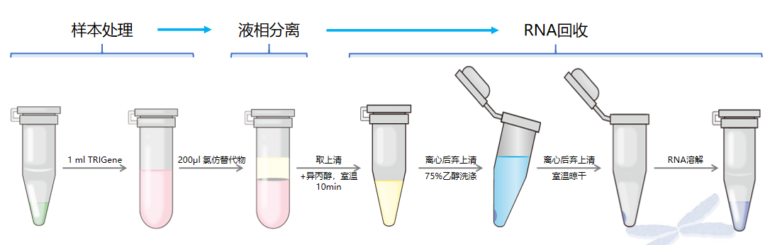 TRIGene Plus 是基于 TriZol 原理制備的一種通用總 RNA 提取試劑。其原理是利用異硫氫酸胍/酚,快速裂解細胞,溶解細胞內含物,抑制核酸酶活性;而后加入 RNA 抽提試劑(RNA Extraction Reagent)去除雜蛋白,RNA 保留在上層水相中,分離后可用異丙醇沉淀回收獲得。采用 RNA Extraction Reagent 替代了氯仿進行 RNA 抽提,上下分相更加清晰且操作安全性更高。使用本產品提取 RNA 純度高,完整度好,產量媲美傳統氯仿法抽提,可直接用于 RT-PCR、Northernblot、dotblot、polyA 篩選、體外翻譯、RNase 保護實驗和分子克隆等一系列操作。