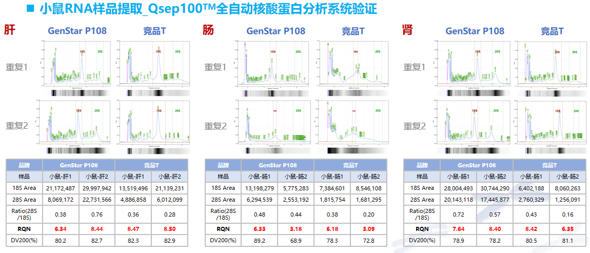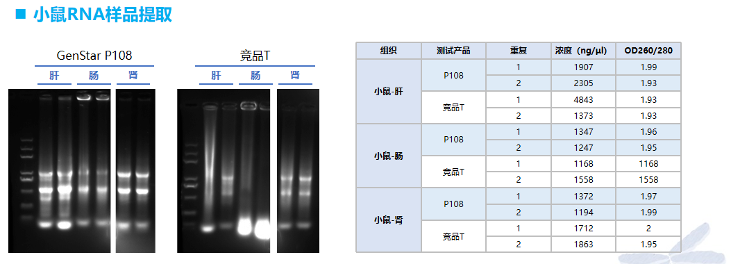 P108 可有效對小鼠不同器官組織進行 RNA 提取,其提取得率與競品 T 相當,提取的 RNA 完整度優于競品 T。