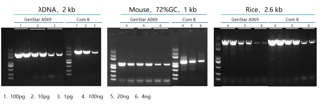 GenStar 2×SuperNova HTS PCR Mix(#A069) 靈敏度與 Com K 相當(dāng),對(duì)于簡(jiǎn)單模板(如 λDNA),模板濃度可檢測(cè)低至 pg 級(jí)。