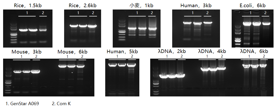 GenStar 2×SuperNova HTS PCR Mix(#A069) 與 Com K 在不同目標(biāo)片段上的表現(xiàn)各有千秋,整體結(jié)果相當(dāng)。
