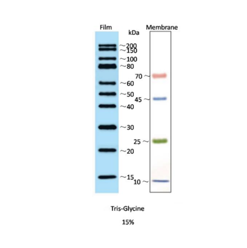 Western Blot Marker 兼容化學發光檢測,熒光標記檢測或其他檢測系統。此外,Western Blot Marker 有兩個增強條帶(30 kDa 和80 kDa)。