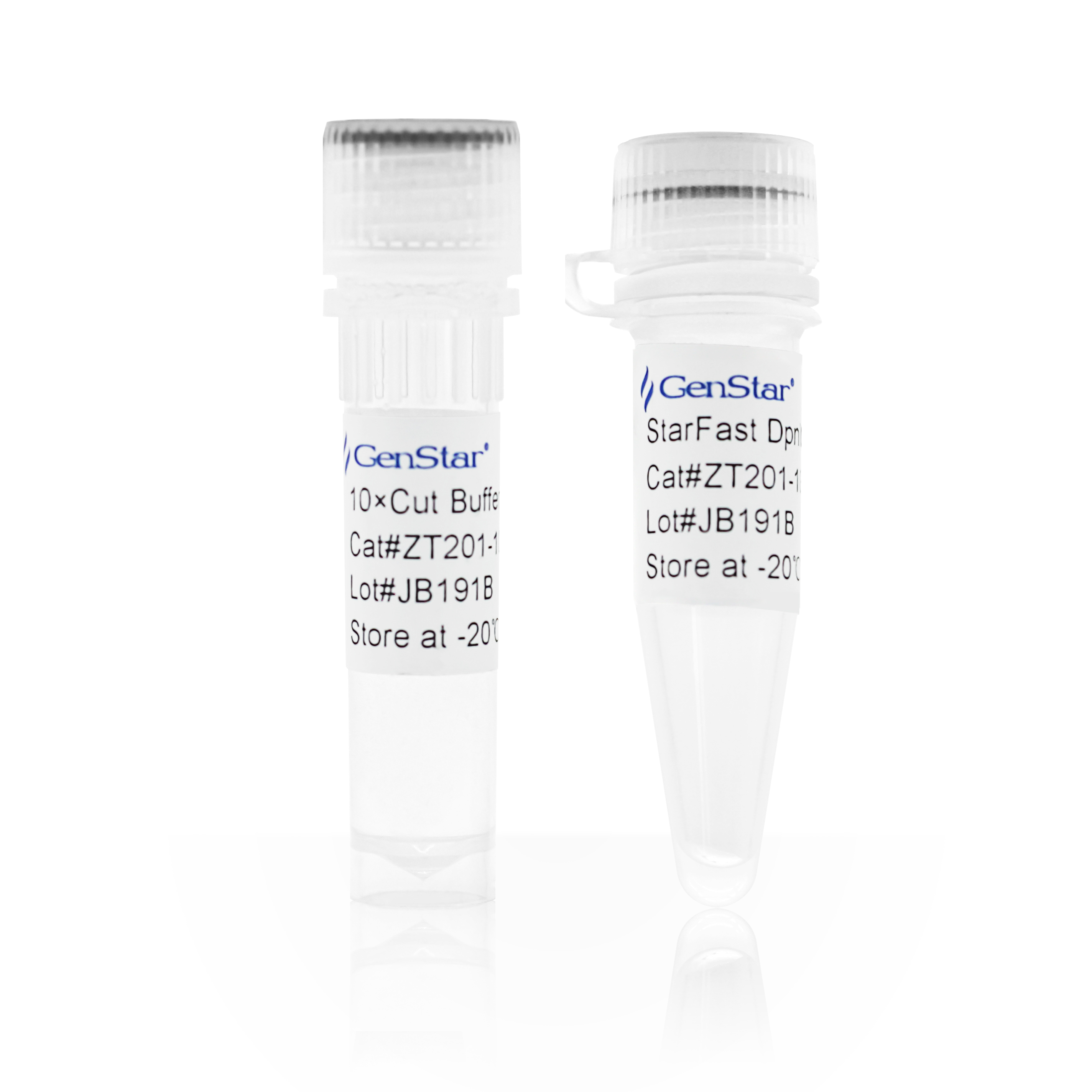 StarFast DpnI 是經過基因工程重組的快速限制性內切酶,適用于質粒 DNA、PCR 產物或基因組 DNA 等的快速酶切。在 10×Cut 緩沖液中具有優良的活性,能夠在 5-15 min 內完成酶切。此外,去磷酸化、連接試劑在 10×Cut 緩沖液中均具有 100% 活性,支持一管化反應,提升“酶切-修飾-連接”的體驗。
