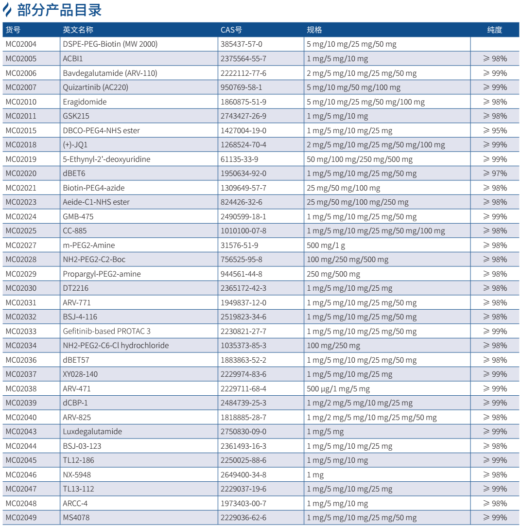 在患者體內,PROTAC 的靶蛋白配體和靶蛋白結合,E3 泛素連接酶配體和細胞內的 E3 泛素連接酶的底物結合區結合,從而通過 Linker 把靶蛋白“拉近”到 E3 泛素連接酶旁邊,實現 UPS 系統將靶蛋白降解。GenStar目前可提供多種 PROTAC 相關分子產品,包含:PROTACS、PROTACLinker、Ligands for E3 Ligase.Ligands for Target Protein for PROTAC、 Molecular Glues、ATTECs、E3 Ligase Ligand-LinkerConjugates 等。