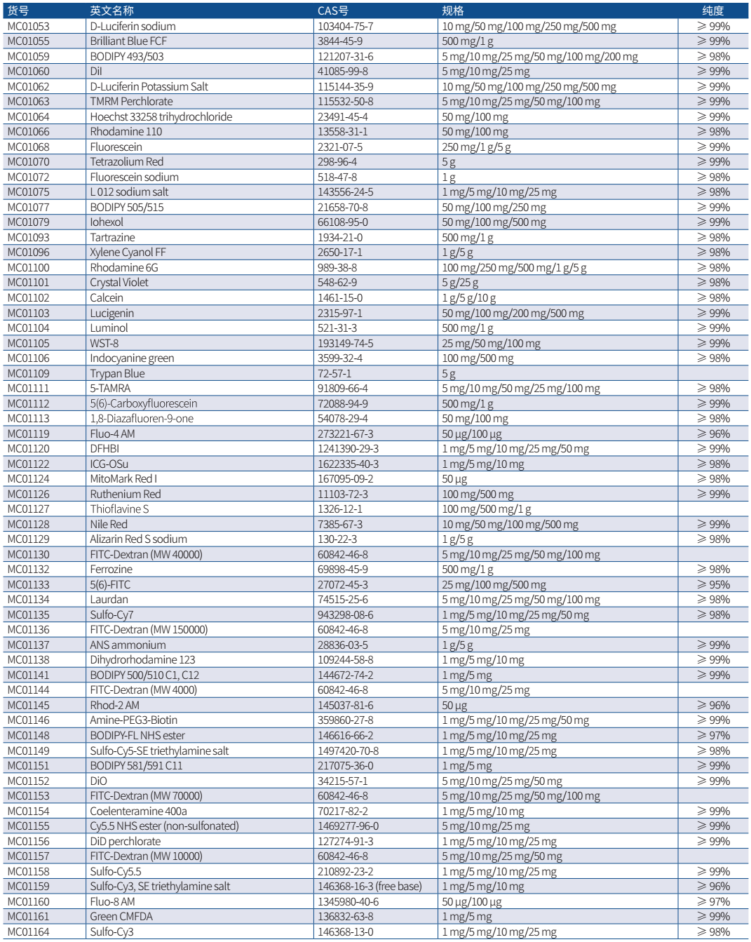 熒光染料是指吸收某一波長的光波后能發射出另一波長大于吸收光的光波的物質。通過共價結合或物理吸附在所要研究物質結構中,借助熒光特性對被標記對象進行定性、定位以及定量分析。其在蛋白的功能研究、藥物篩選等領域具有廣泛的應用。