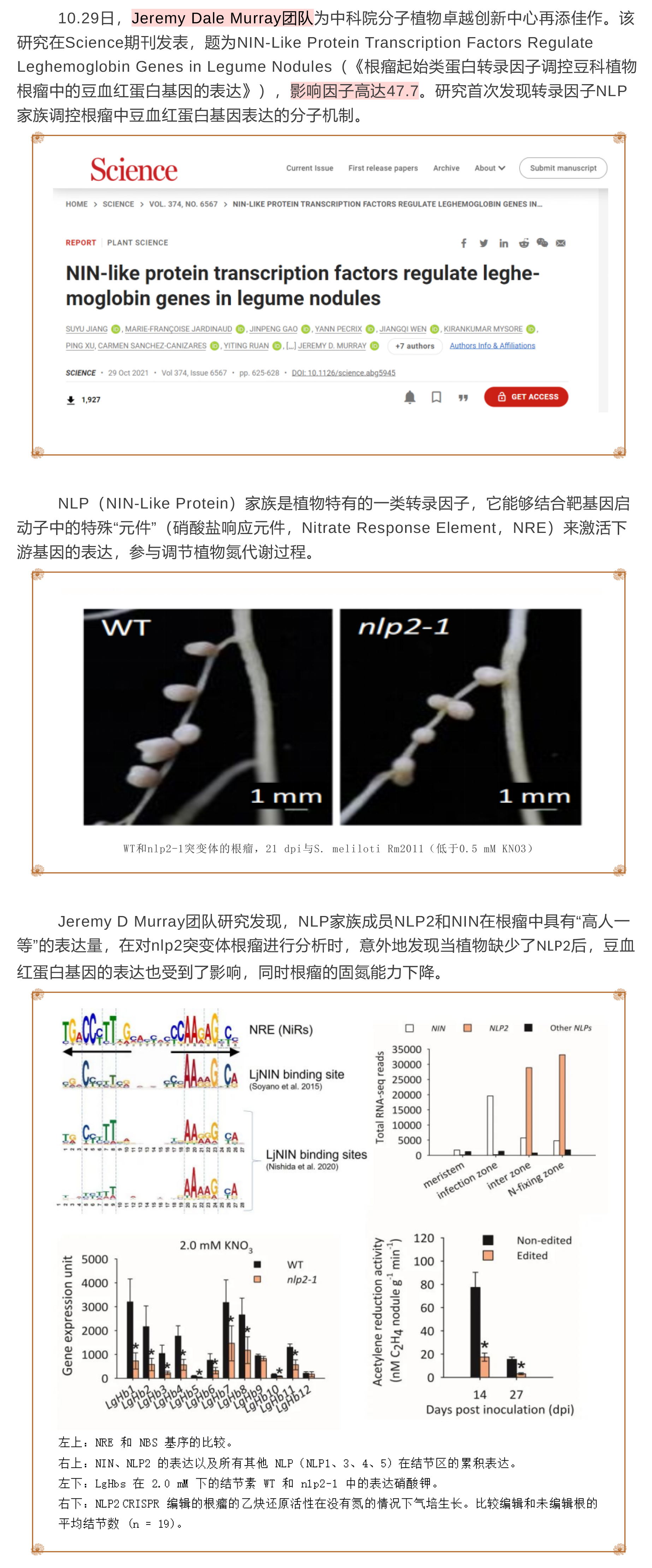 該團隊進一步研究發現NLP家族成員NIN和NLP2通過直接結合豆科植物保守的雙重硝酸鹽響應元件(dNRE)來激活根瘤中豆血紅蛋白基因的表達,平衡固氮所必需的氧氣微環境。系統發育分析表明,dNRE和NLP2僅在豆科植物中高度保守,暗示著其進化有助于提高根瘤中豆血紅蛋白的表達水平。而非共生血紅蛋白的攜氧特性有助于植物在低氧環境中生存。